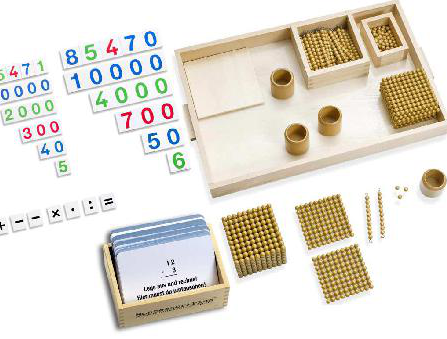 Das Goldene Perlenmaterial ist eines der Montessori-Materialien, das auch im jahrgangsgebundenen Mathematikunterricht eingesetzt wird.